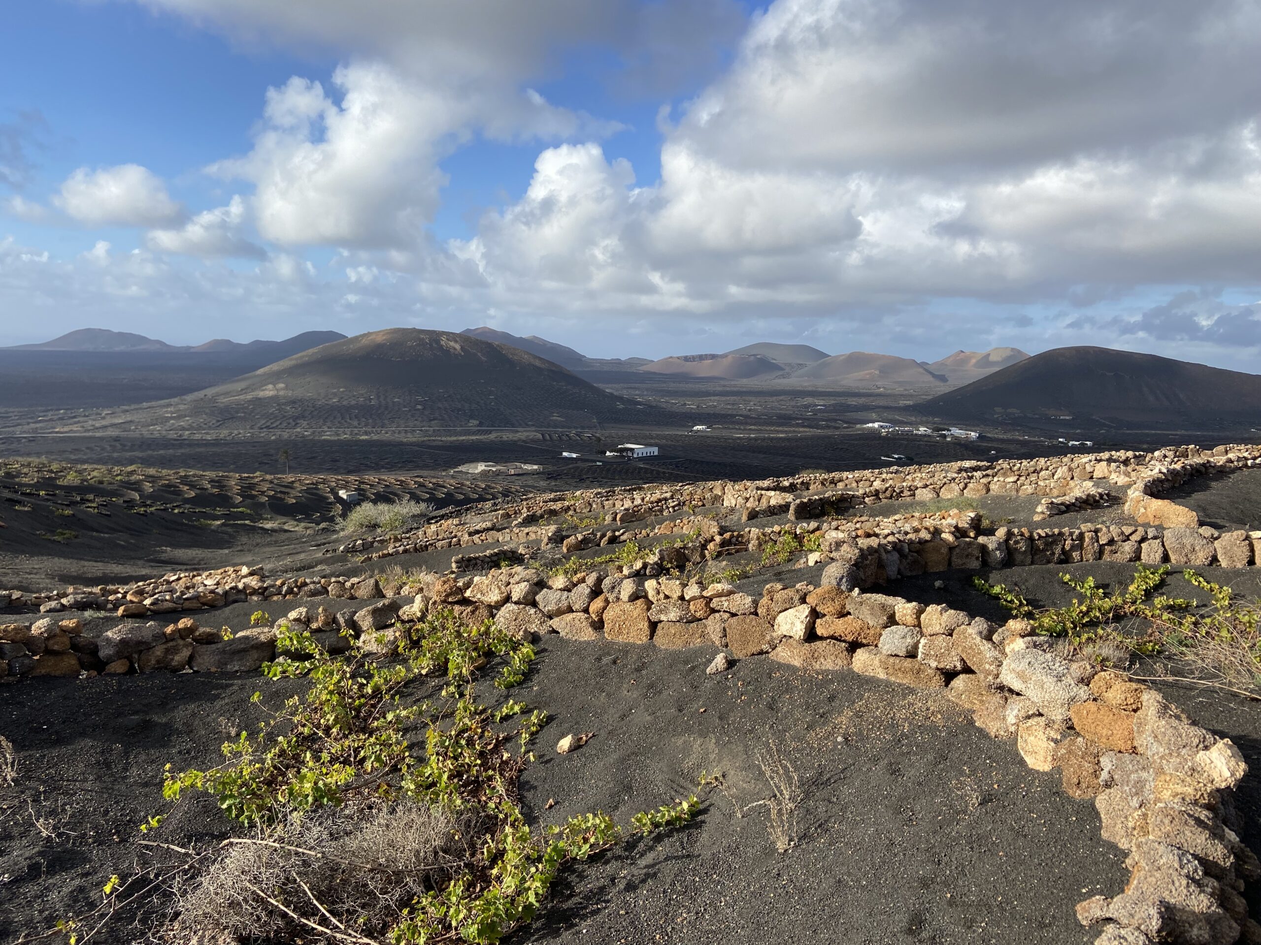 Das Weinbaugebiet im Vordergrund, der Timanfaya Nationalpark im Hintergrund