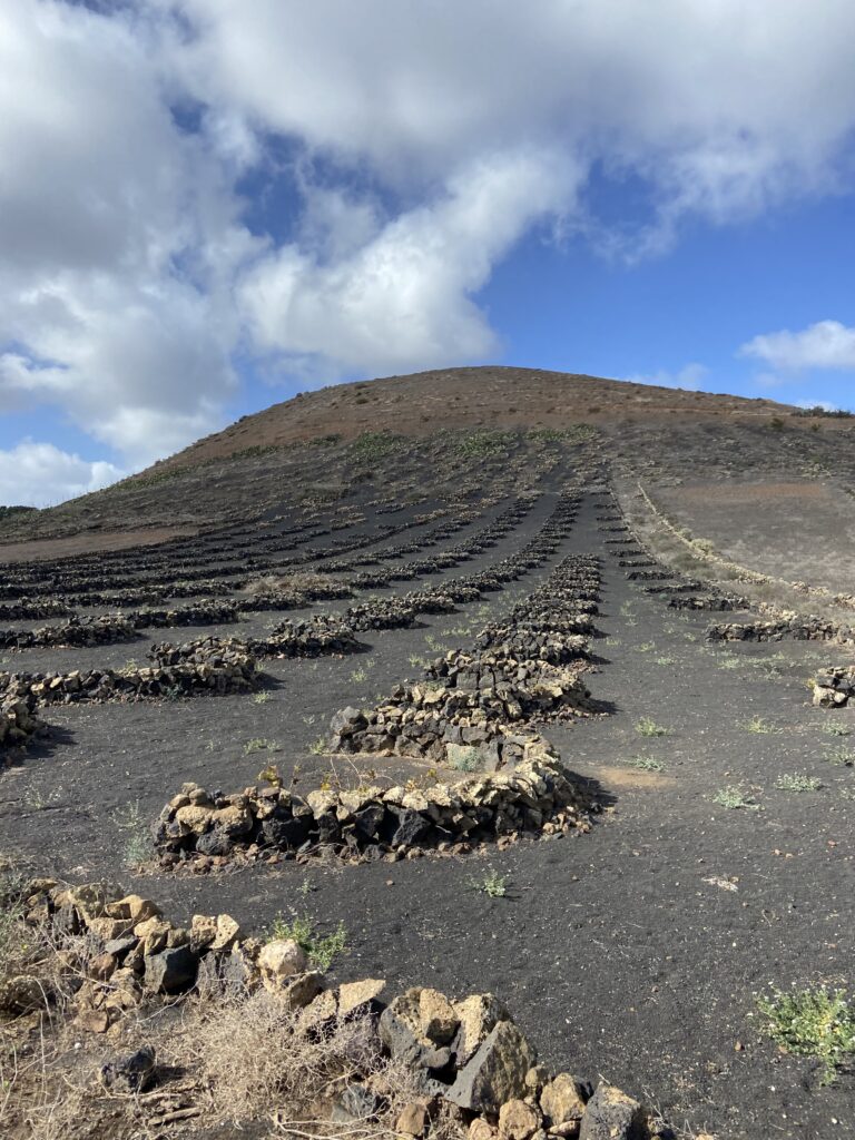 Das Weinbaugebiet im Vordergrund, der Timanfaya Nationalpark im Hintergrund